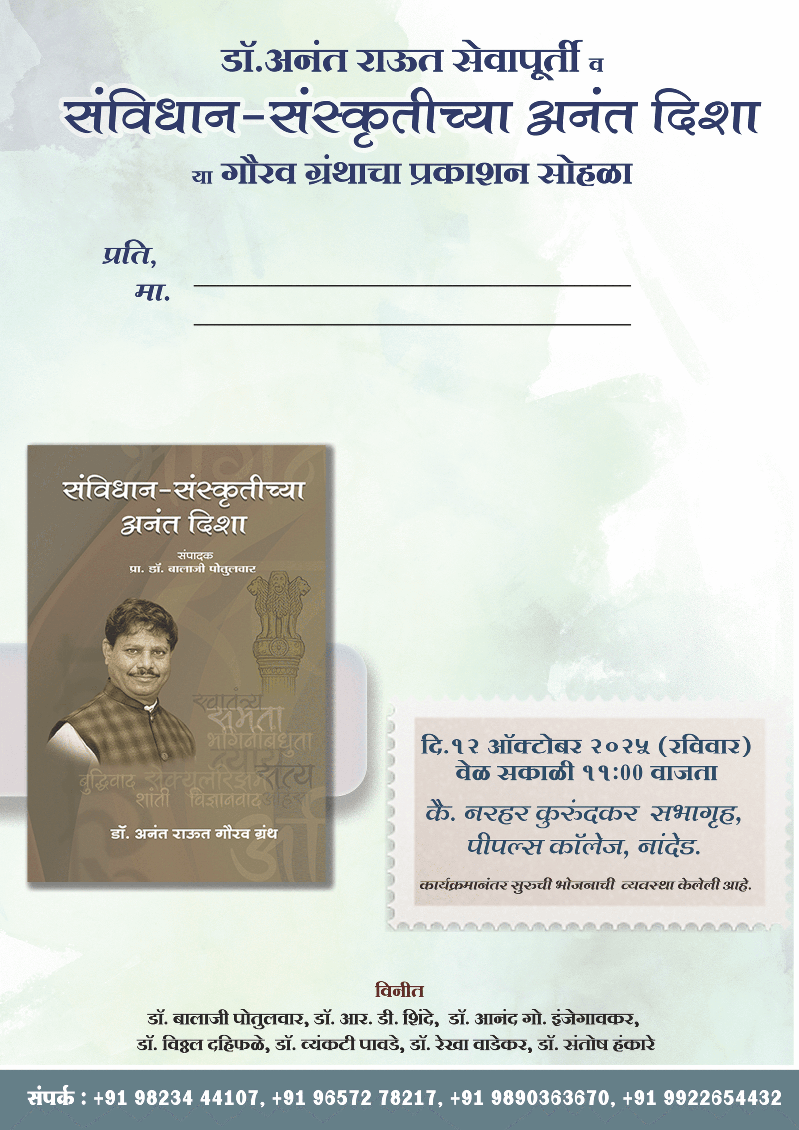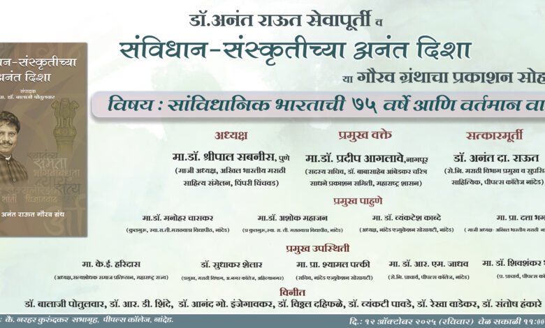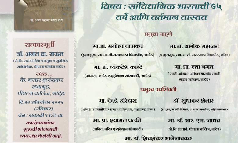 पीपल्स कॉलेज, नांदेड येथील मराठी विभागाचे प्रमुख आणि संविधानवादी साहित्यप्रवाहाचे अग्रणी विचारवंत प्रा. डॉ. अनंत दादाराव राऊत यांच्या सेवापूर्तीनिमित्त आयोजित ‘संविधान-संस्कृतीच्या अनंत दिशा’ या गौरवग्रंथाचा प्रकाशन सोहळा रविवार, दि. 12 ऑक्टोबर रोजी सकाळी 11 वाजता कै. नरहर कुरुंदकर सभागृह, पीपल्स कॉलेज येथे होणार आहे.